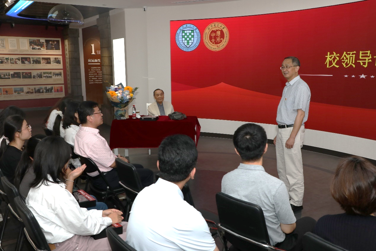 在大家的簇拥下,刘珣教授在校史馆模拟情景现场,饶有兴致地讲起他所亲历的北语建校发展的历史,生动再现了老一辈国际中文教师教育家们教书育人、爱岗敬业的生动故事。在报告中,刘珣教授从事业和学科的发展分期、教材编写、测试研制、教学理论与教学方法研究等方面回顾了学科初创时期的北语,带领老师们深入走进了那段峥嵘岁月。刘珣教授是我国对外汉语教育事业的重要奠基者之一、汉语作为第二语言教学学科体系的创建者之一。段鹏校长在今年的毕业典礼致辞中讲到,刘珣教授将自己的事业概括为“四件小事忙半生”,“一套教材、一份考卷、一本小书、一张课表”这四件小事奠定了汉语国际教育的学科基础,填补了早期教学研究空白。
