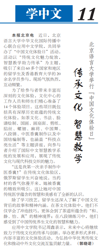 每学期开展中国文化体验日, 国际学生在一天的文化盛会中体验中国茶、剪纸、脸谱、画扇面、国画、书法、中国结、麻将、中国舞、香囊、掐丝、螺钿、八段锦等10余项传统文化,受到央视总台国际、阿语、大亚湾频道,中新网,人民日报等媒体的关注及报道。