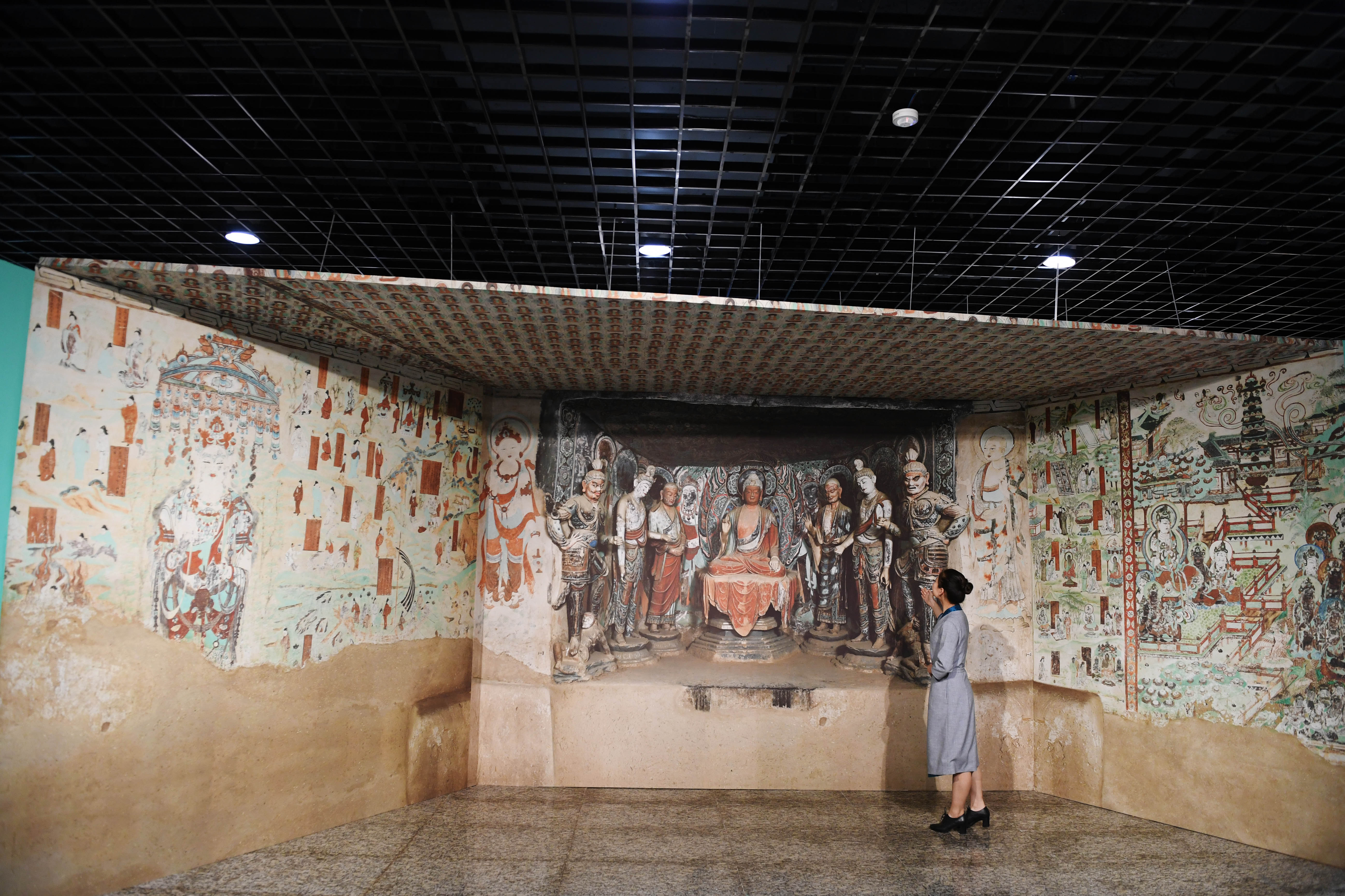高保真复制的莫高窟第45窟“彩塑一铺”亮相敦煌。(资料图)中新社记者 杨艳敏 摄